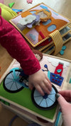 « Mon premier vélo » est bien plus qu’un simple livre tissu coloré – c’est un livret d’activités riche et varié qui ouvre à l’enfant un univers de découvertes et de jeu. Dès la couverture, un garçon joyeux avec son vélo l’accueille, et à l’intérieur l’attendent de nombreuses aventures interactives : pêcher des poissons, habiller des pandas ou nourrir des animaux avec leurs plats préférés.
